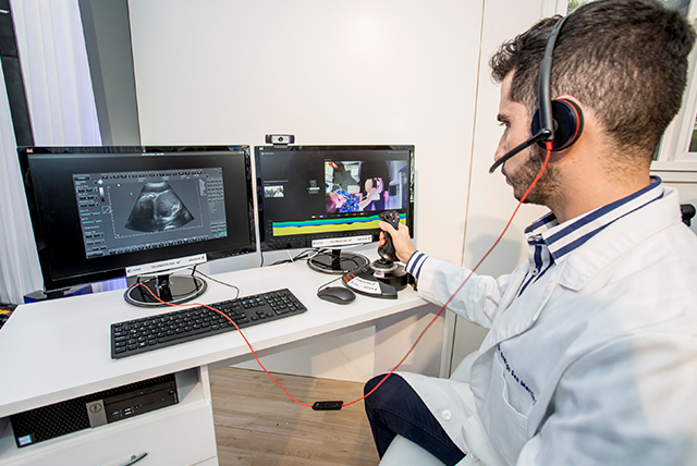 En la prueba, se pudo apreciar cómo un doctor dirigió el examen a través de un joystick (o control de mando inalámbrico) que permitía comandar a distancia los movimientos del ecógrafo a través de un guante sensorizado que era sostenido por un paramédico en otro lugar del recinto.
