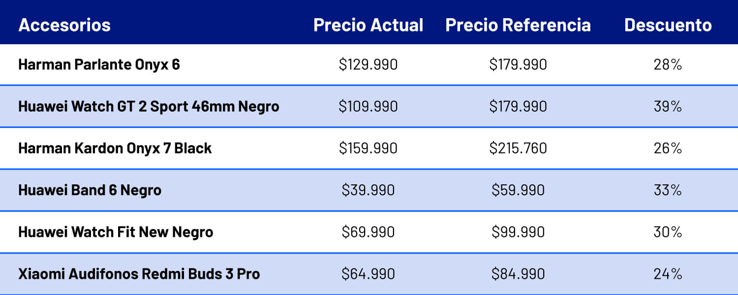 Hay diversos accesorios en promoción para esta fecha (ver tabla). Destacan los parlantes Harman Kardon, donde se puede encontrar la última versión, el Onyx 7 con un 26% de descuento y el modelo anterior, Onyx 6 con una rebaja de 28%. En cuanto a relojes, el smartwatch Huawei Watch GT 2 Sport 46MM, que tiene una autonomía de dos semanas, está con un descuento de un 39%.