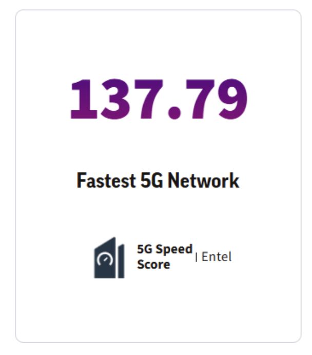 Respecto a la tecnología 5G, la empresa de tecnología y telecomunicaciones Entel también destacó al obtener una puntuación de velocidad de 137,79. Su velocidad media de descarga 5G fue de 162,88 Mbps, superando a Movistar, que alcanzó 150,41 Mbps, y a WOM, que registró 138,27 Mbps. En cuanto a la velocidad media de subida 5G, Entel logró 23,59 Mbps y una latencia 5G de solo 34 ms.