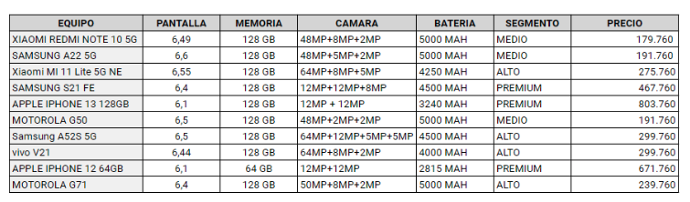 Como se puede ver en el siguiente cuadro, actualmente existen smartphones 5G de gama media con precios cercanos a $180.000 y $190.000, como el Xiaomi Redmi Note 10 5G y el Samsung A22 5G respectivamente. Por otro lado, los equipos Apple, a pesar de tener un precio más alto y ser “premium”, también están entre los favoritos de los usuarios.