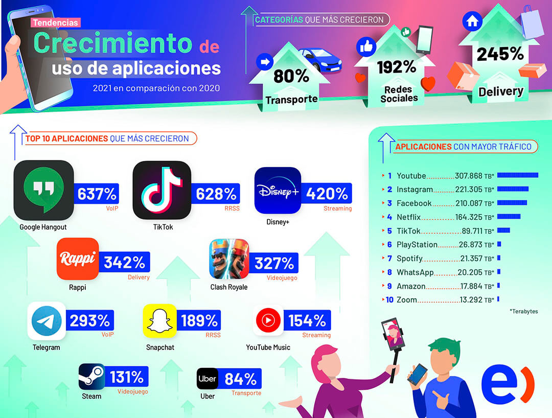 En su último reporte se pudo evidenciar que las categorías de aplicaciones que más crecieron el 2021 -en comparación a 2020- son las de Delivery (alza de un 245%) y las Redes Sociales (alza de un 192%); en tercer lugar se ubicaron las app de Transporte, que crecieron un 80%.