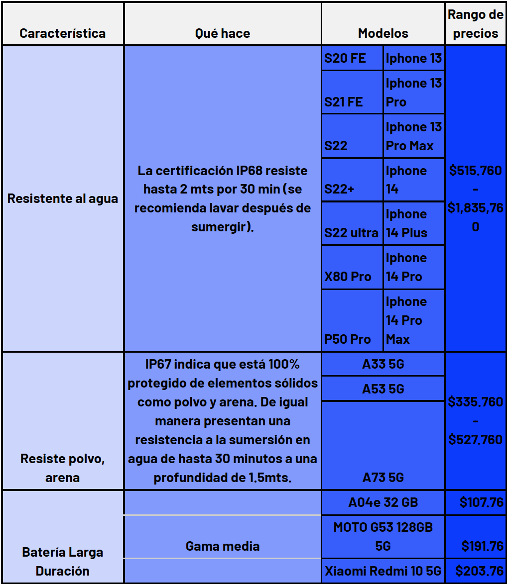 Hay varios tips importantes para cuidar el teléfono y no pasar malos ratos. En primer lugar, la clave es saber la “Certificación IP” con la que cuenta el equipo. Esto significa el nivel de protección que tienen los teléfonos frente a “partículas o cuerpos extraños” como el agua, el polvo o la arena. Hoy, el ideal es tener IP67, que permite sumergirlo al agua —con una profundidad de un metro y durante un máximo de 30 minutos— y también hacer un trekking y ensuciarlo (ver tabla para mayor información).