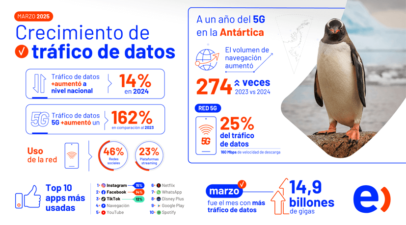 - • Instagram fue la red social más utilizada por los usuarios, consolidando el 15% del uso de los datos por parte de los usuarios, seguida por Facebook con un 14% y TikTok con un 12%. Respecto al 5G, el tráfico en esta red creció en un 162%, mientras que en la Antártica, desde su despliegue en 2024, el volumen de datos creció 274 veces.