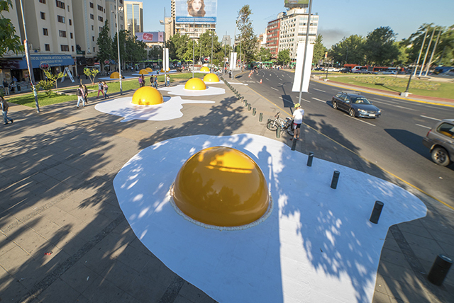 10 huevos fritos gigantes de plástico y de 3x15 metros cada uno, aparecieron en plena Plaza Italia, a la salida de la Estación Baquedano, despertando la curiosidad de los transeúntes e invitándolos a jugar como niños