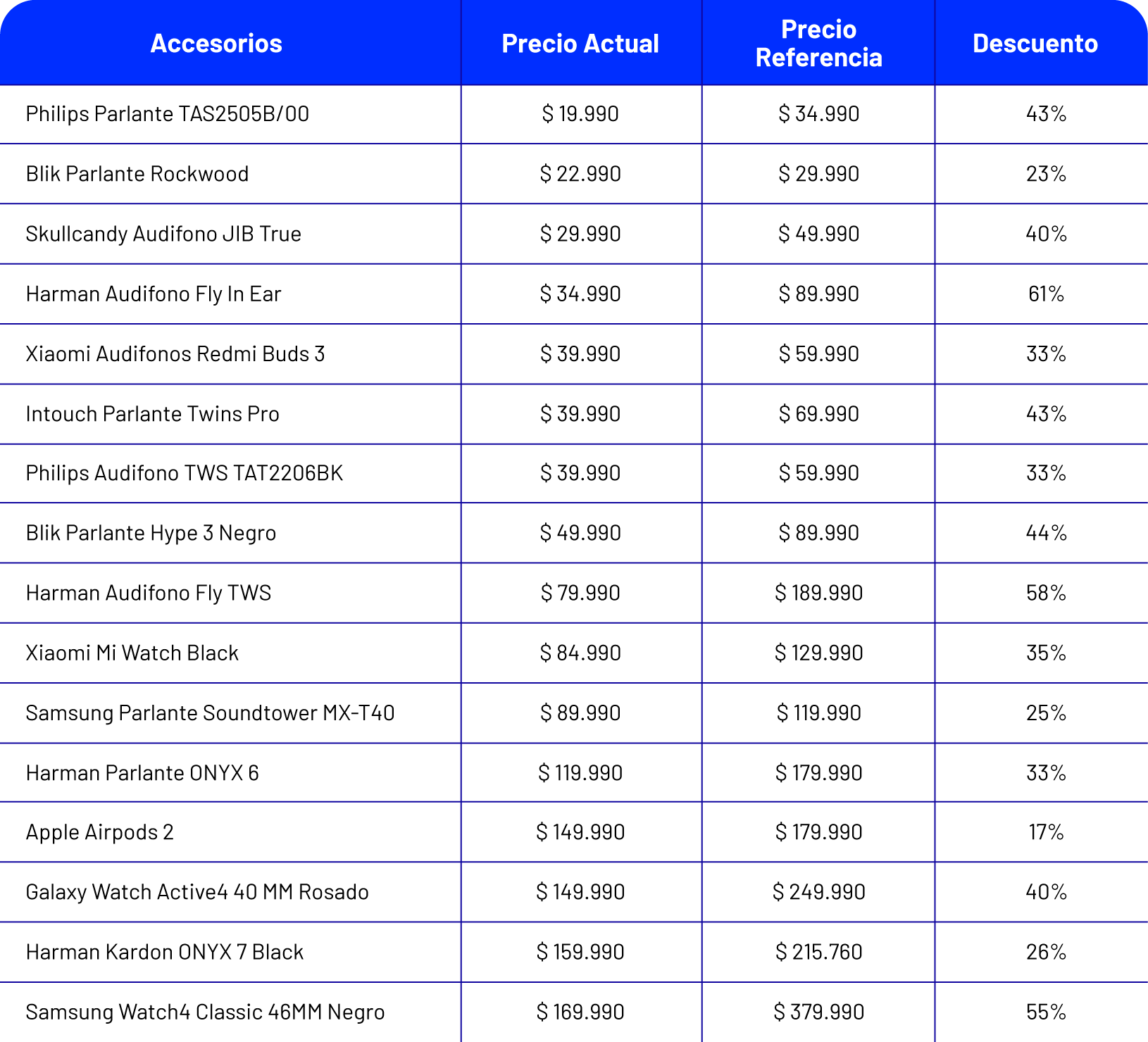 - Speakers, smartwatches and external batteries are some of the accessories in which the technology and telecommunications company has unmissable discounts of up to 60%, so that the Fiestas Patrias do not lack dance, music, connectivity or cueca feet anywhere in the country.