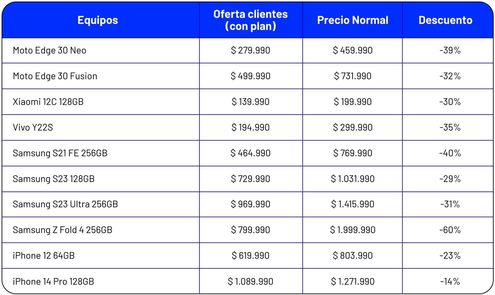 [Note of the Translator: the blue headlines of each column have the following text: ‘Devices’, ‘Special price for clients (with plan)’, ‘Normal price’, ‘Discount’]