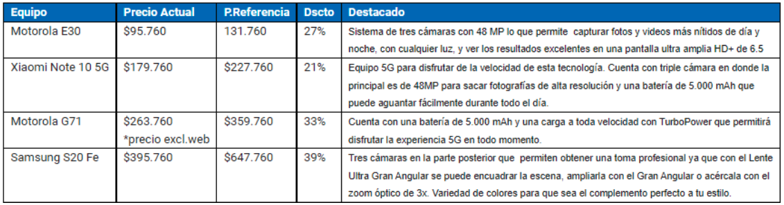 [Note of the translator: The blue headlines read as follows: “Device”, “Current Price”, “Reference Price”, “Discount”, “Highlighted”.The last column has the following text from top to bottom: “48 MP camera system allowing to capture sharper photos and videos day and night, in any light, and see excellent results on an ultra-wide HD + 6.5” screen.5G device to enjoy the speed of this technology. It has triple camera, the main one is 48MP to take high resolution photos and 5000 mAh battery that easily lasts all day.5000 mAh battery and full speed charging with TruboPower allows you to enjoy the 5G experience at all times.Three cameras on the back allow you to get a professional shot. With the Ultra Wide Angle lens you can frame the scene, zoom in with the Wide Angle or zoom in with the 3X optical zoom. Variety of colors to make it the perfect complement to your style.”]