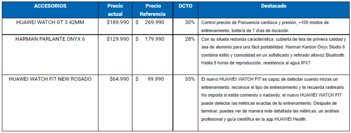 [Note of the translator: The blue headlines read as follows: “Accesories”, “Current Price”, “Reference Price”, “Discount”, “Highlighted”. The last column has the following text from top to bottom: “Precise heart rate and blood pressure monitoring, + 100 training modes, 7-day battery life. With its round silhouette, premium fabric cover and aluminum handle for easy portability, Harman Kardon Onyx Studio 6 combines style and comfort in a sophisticated and refined Bluetooth speakerphone. Up to 8 hours of playback, IPX7 water resistance.The new HUAWEI WATCH FIT is able to detect when you start a workout, recognizes the type of workout and reminds you to track it. No matter you are running or swimming, the new HUAWEI WATCH FIT can detect the exact metrics of your workout. After finishing, you can see more detailed metrics, professional analysis and scientific guidance in the HUAWEI Health app.]