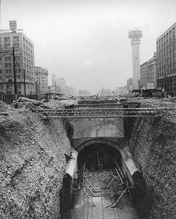 Construction of the tower next to a parking lot with cars of the time, which would later become the La Moneda subway station.