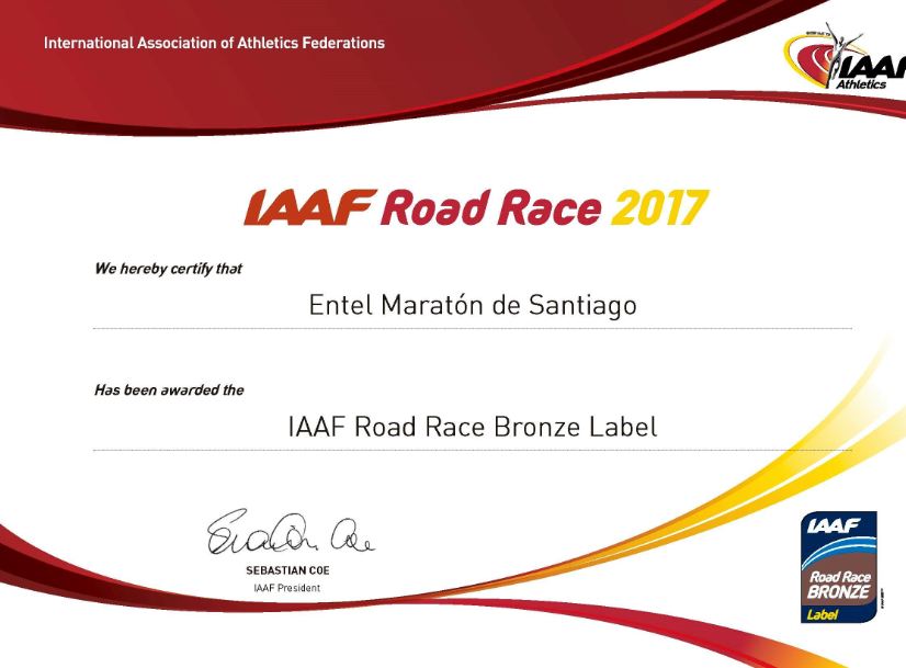 The president of the Corporación Marathon of Santiago, Fernando Jamarne, commented: “We are very happy because the Entel Marathon of Santiago is and will continue to be an international level competition. This year we will have 30 thousand registered participants; Érika Olivera, the greatest athlete of our times, will say goodbye in it, and the 42-kilometer circuit will be marked by the international Blue Line. This endorsement and recognition from the IAAF crowns the work we have been doing for eleven years”.