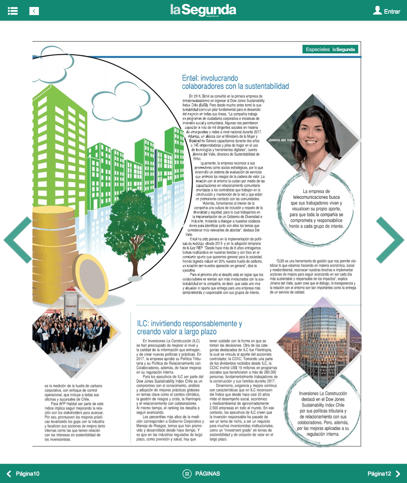 En 2016, Entel se convirtió en la primera empresa de telecomunicaciones en ingresar al Dow Jones Sustainability Index Chile (DJSI). Pero desde mucho antes tomó la sustentabilidad como un pilar fundamental para el desarrollo del negocio en todas sus líneas. “La compañía trabaja en programas de ciudadanía corporativa e iniciativas de inversión social y comunitaria. Algunas nos permiten capacitar a mas de mil dirigentes sociales en materia de emergencias y redes a nivel nacional durante 2017. Además, en alianza con el Ministerio de la Mujer y Equidad de Género capacitamos durante dos años a 145 emprendedores y jefas de hogar en el uso de tecnologías y herramientas digitales”, cuenta Jimena Del Valle, directora de Sustentabilidad de Entel.