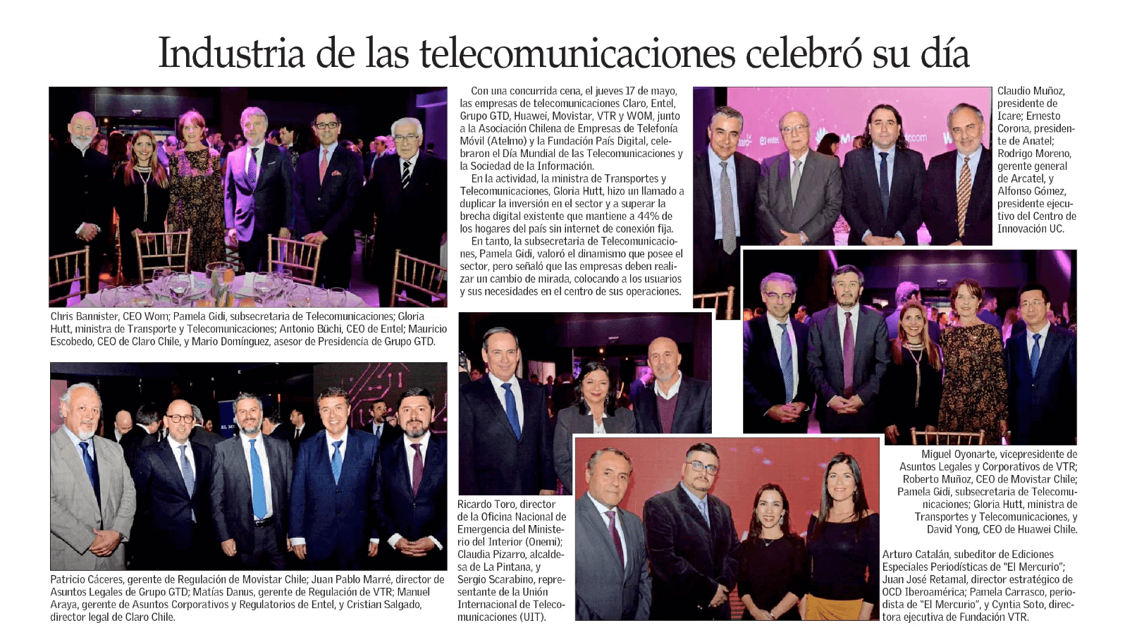 Con una concurrida cena, el jueves 17 de mayo las empresas de telecomunicaciones Claro, Entel, Grupo GTD, Huawei, Movistar,VTR y WOM, junto a la Asociación Chilena de Empresas de Telefonía Móvil (Atelmo) y la Fundación País Digital, celebraron el Día Mundial de las Telecomunicaciones y la Sociedad de la Información.