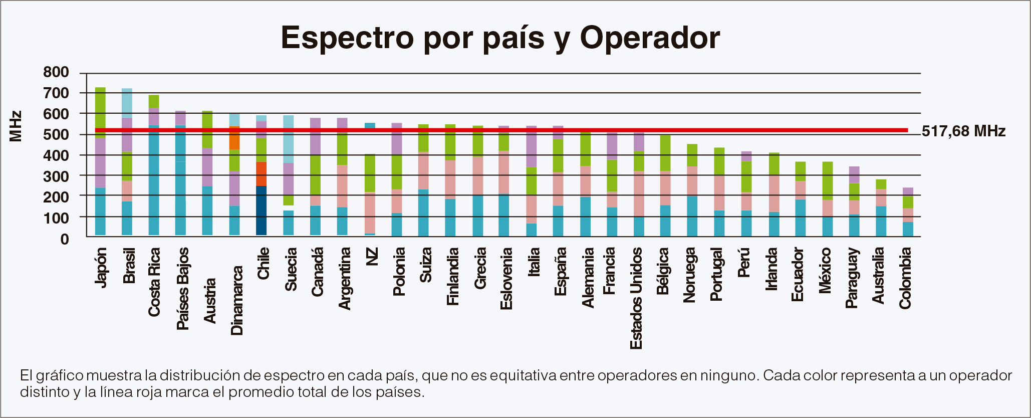 En el siguiente gráfico se muestra la distribución de espectro en cada país, que no es equitativa entre operadores en ninguno. Cada color representa a un operador distinto y la línea roja marca el promedio total de los países.